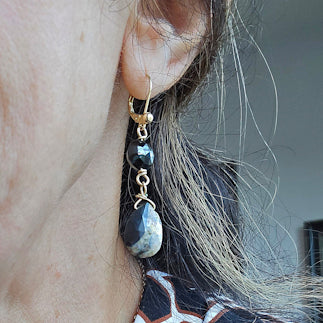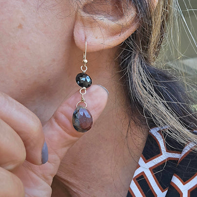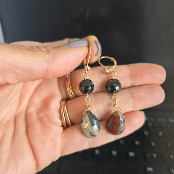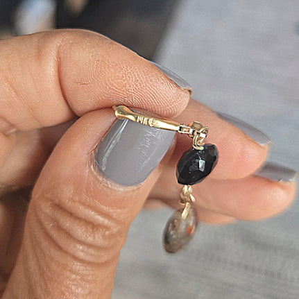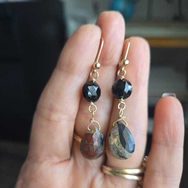14kt gold faceted red jasper briolettes and faceted black garnets wire wrapped using 14kt gold filled wire.