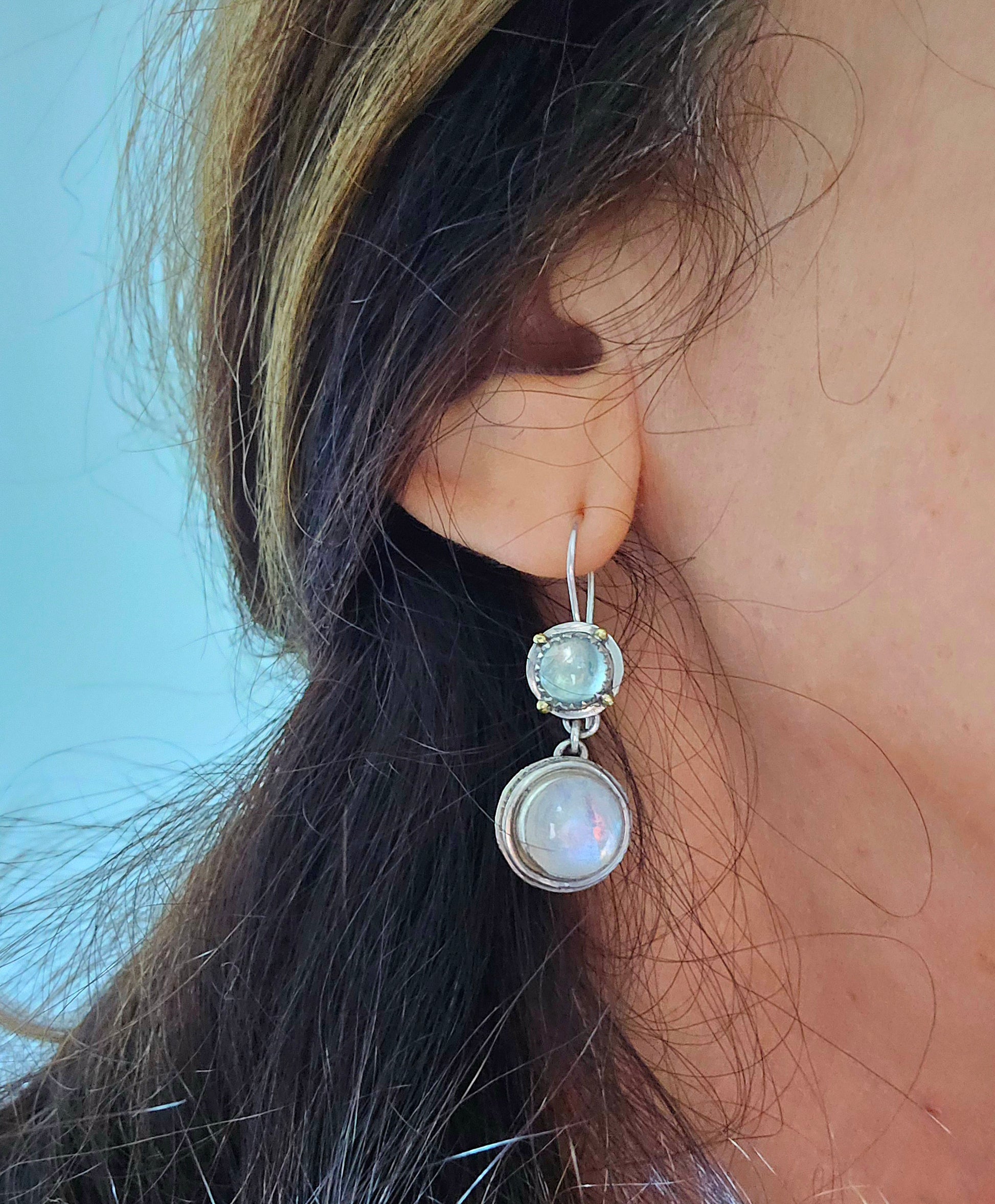 These are 2 natural aquamarines and 2 moonstones set using .925 sterling silver and 18kt gold accents.