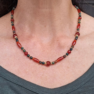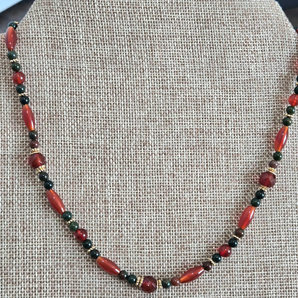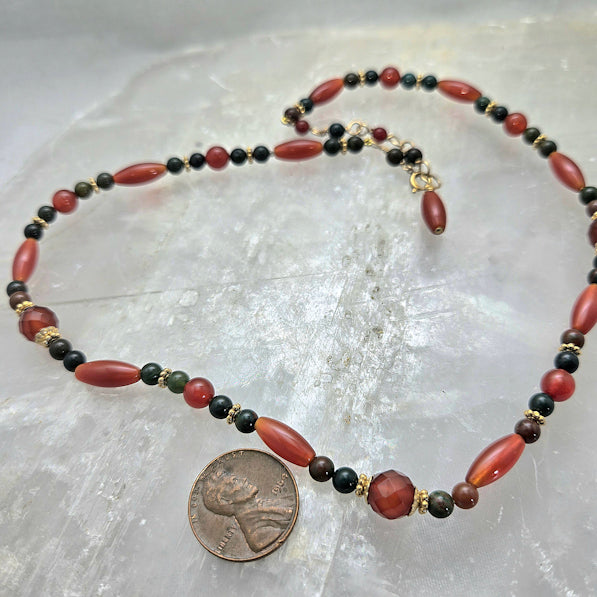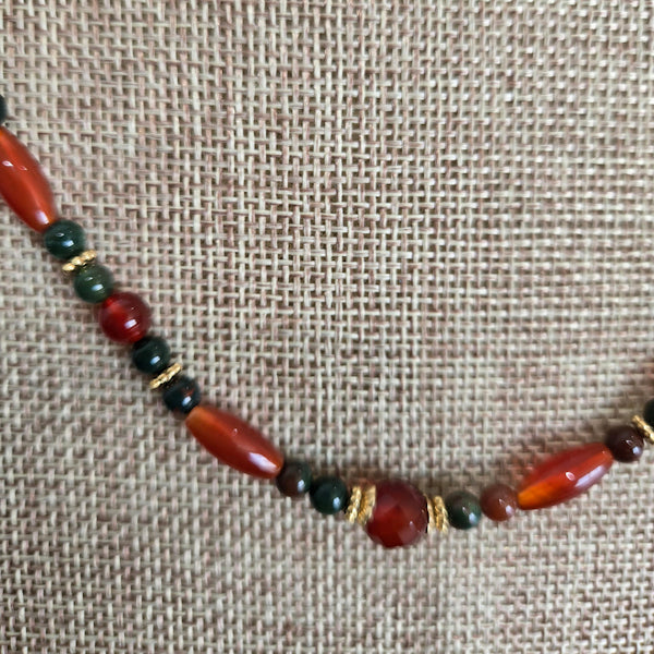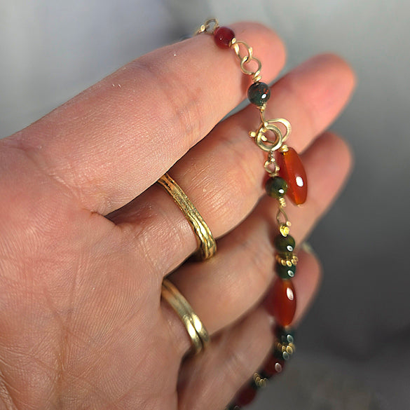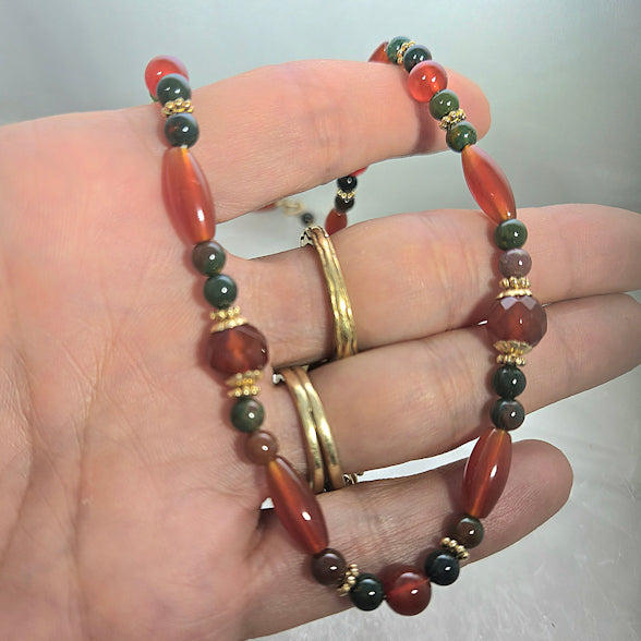 Faceted and smooth carnelian and bloodstone beads strung using 14kt gold filled findings.