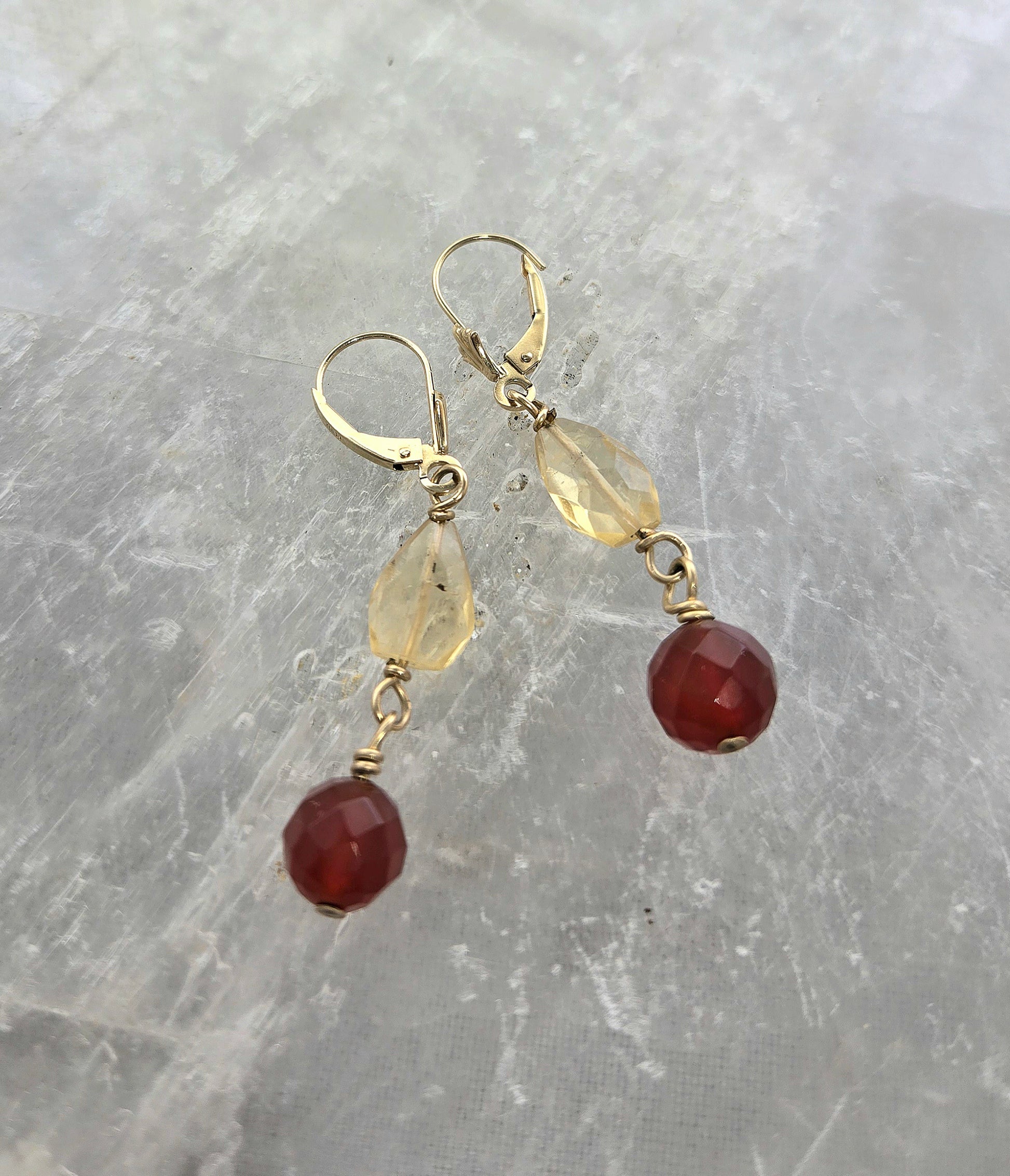 14kt gold leverback earrings including faceted citrine and carnelian stones wire wrapped using 14kt gold filled wire.