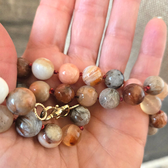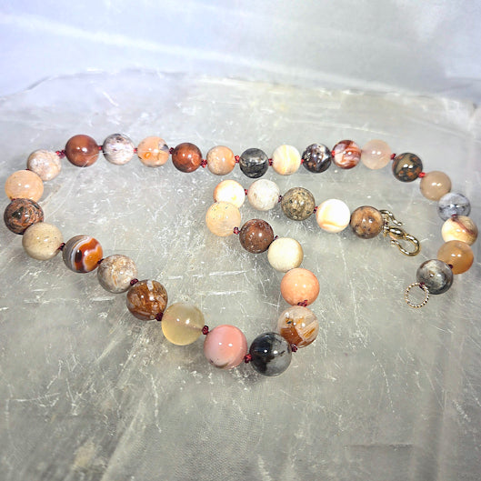 These are 10mm natural ocean jasper beads hand strung and knotted on silk with a 14kt gold-filled "S" hook clasp and 14kt gold findings.