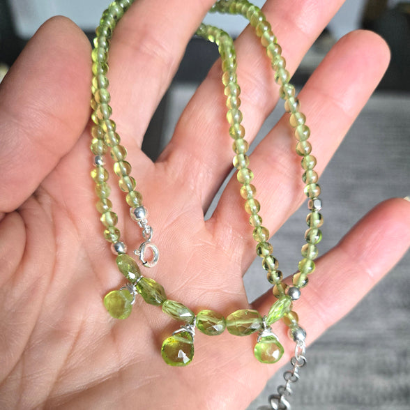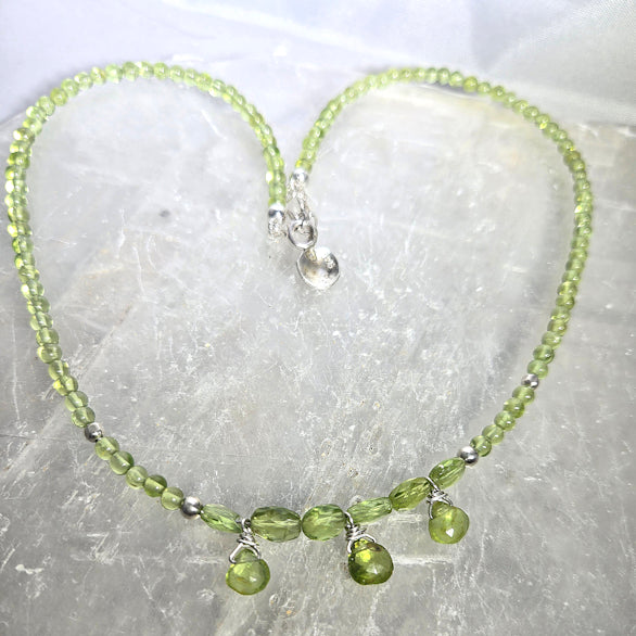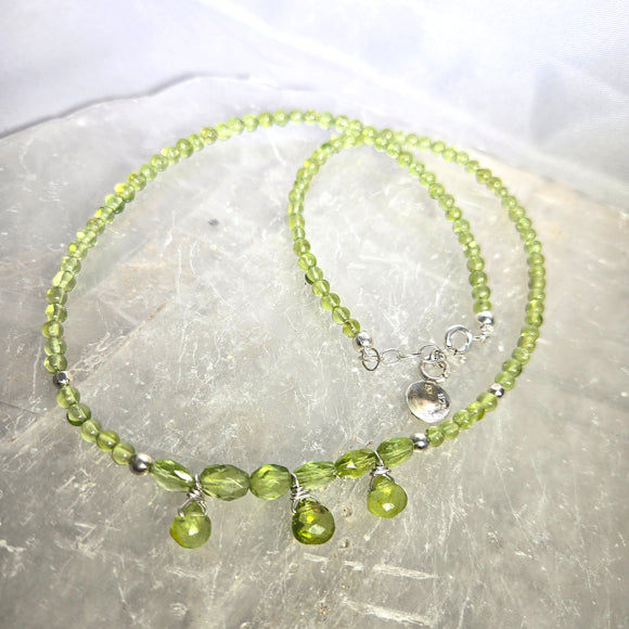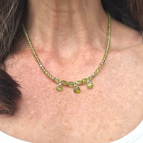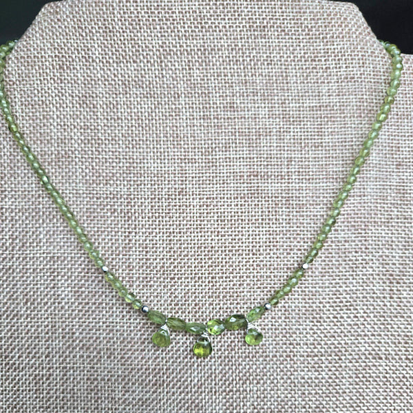 Smooth round, faceted oval, and faceted pear shaped briolette beads and sterling silver beads combine to make this beaded necklace.