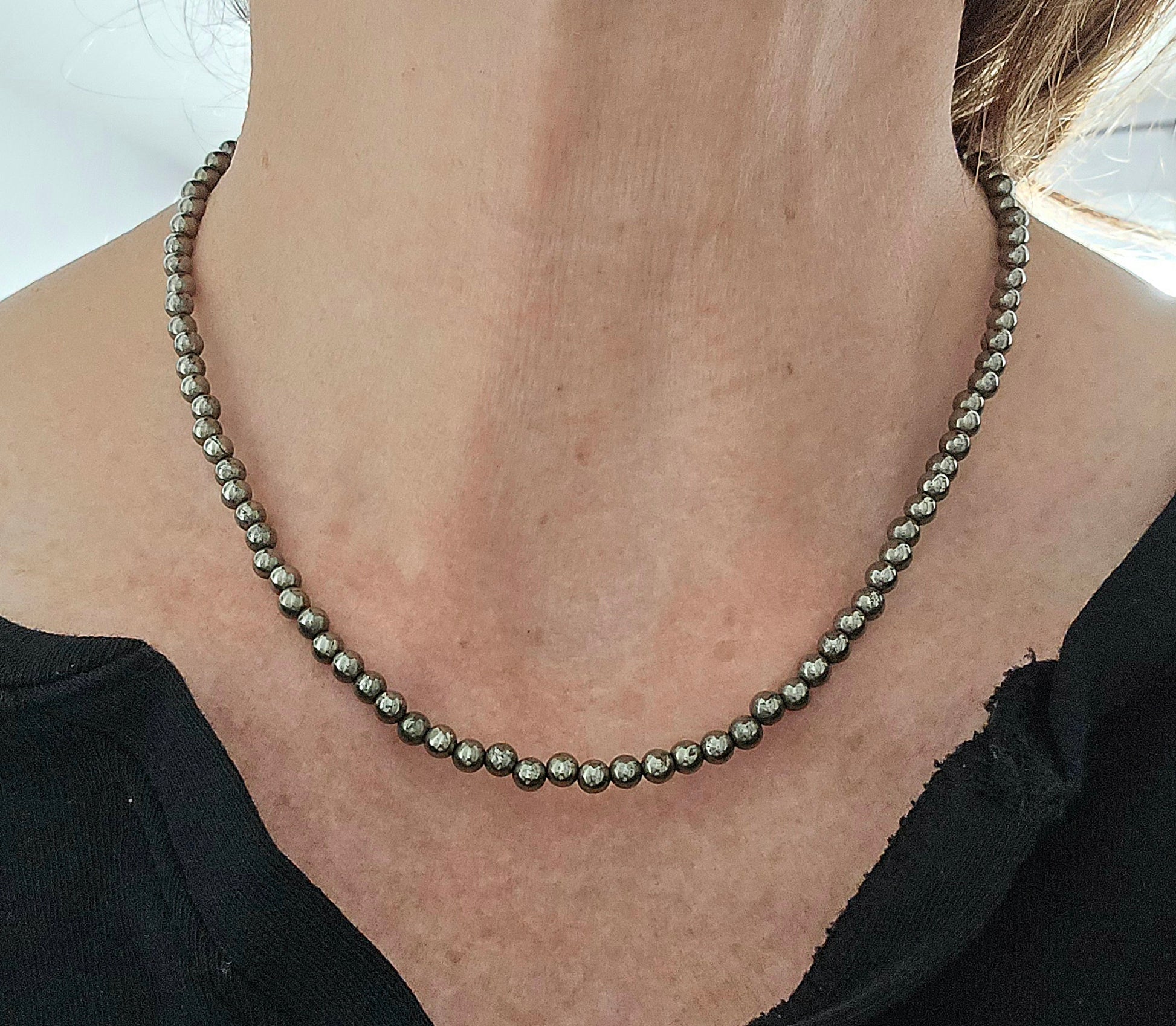 These are smooth round pyrite beads, strung using all .925 sterling silver clasp and findings.