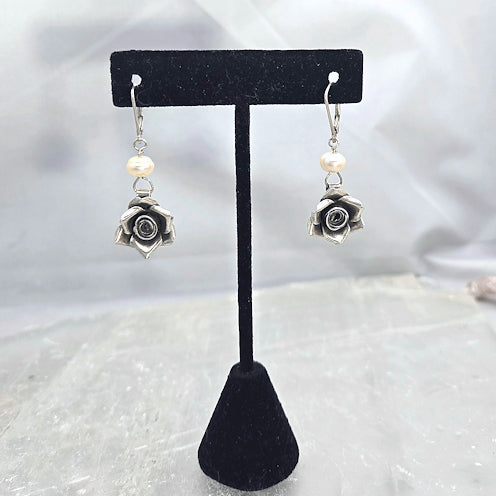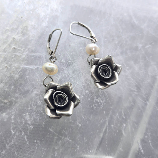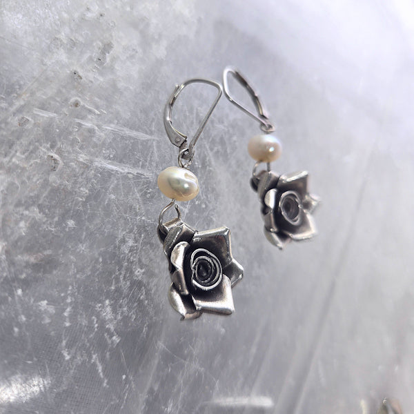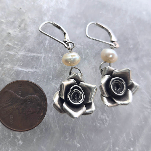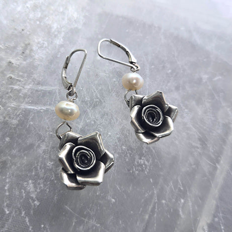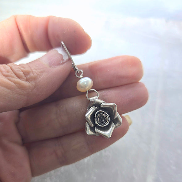 These are 2 fresh water pearls and 2 silver rose components dangling using a simple sterling leverback.